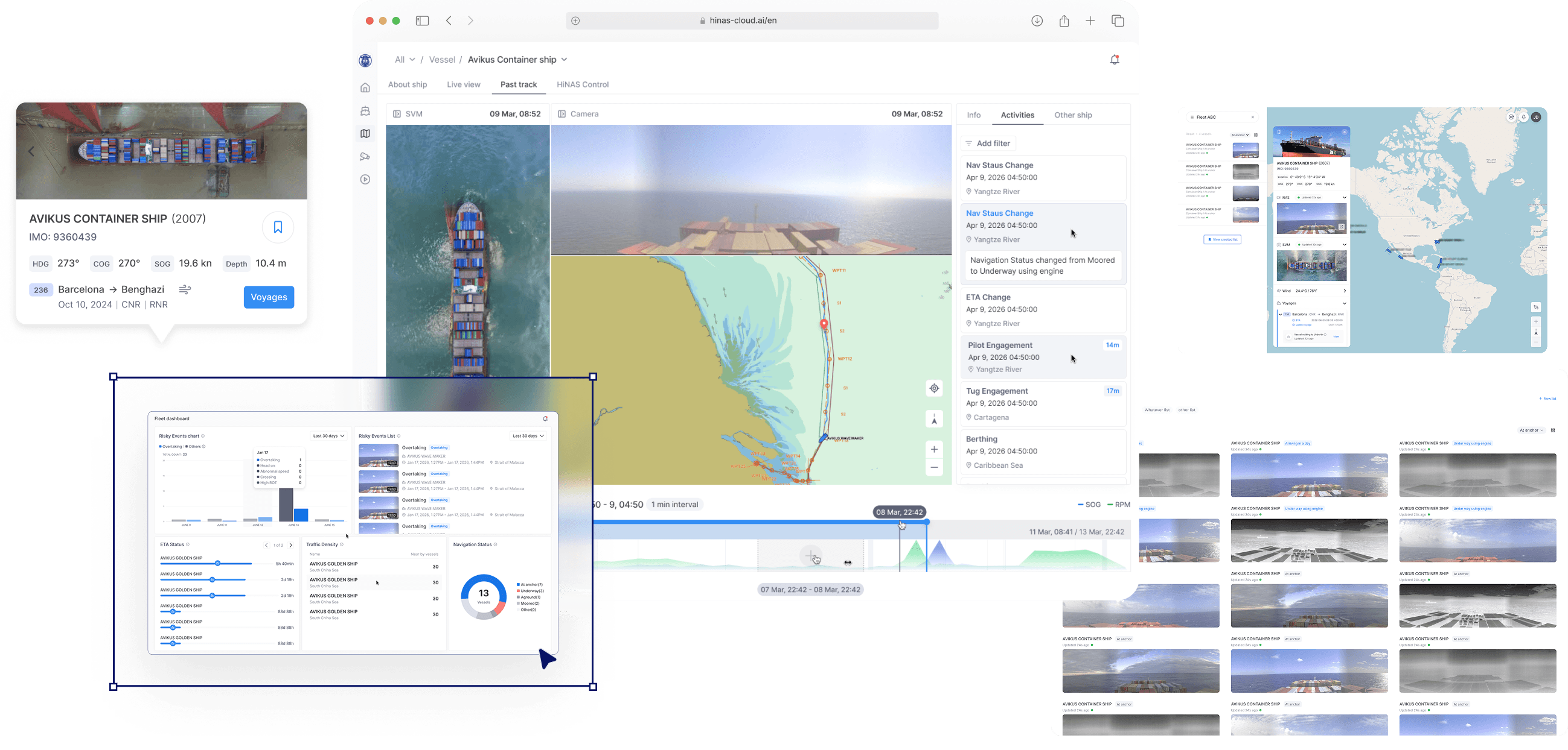 The HiNAS (Hyundai intelligent Navigation Assistant System) family offers a suite of advanced, AI-powered maritime solutions designed to improve safety and efficiency. The main products include: HiNAS Navigation: Enhances situational awareness by providing a sensor-fused Augmented Reality (AR) view to help crews detect obstacles easily HiNAS Control: A Level 2 autonomous navigation system that automatically controls the ship's heading and RPM to follow routes, avoid collisions, and optimize fuel usage HiNAS SVM (Surround View Monitoring): Provides a 360-degree bird's-eye view around the vessel to ensure safer berthing operations HiNAS Cloud: A centralized fleet management and analytics platform that provides real-time remote monitoring and incident playback to streamline fleet operations and enhance overall safety