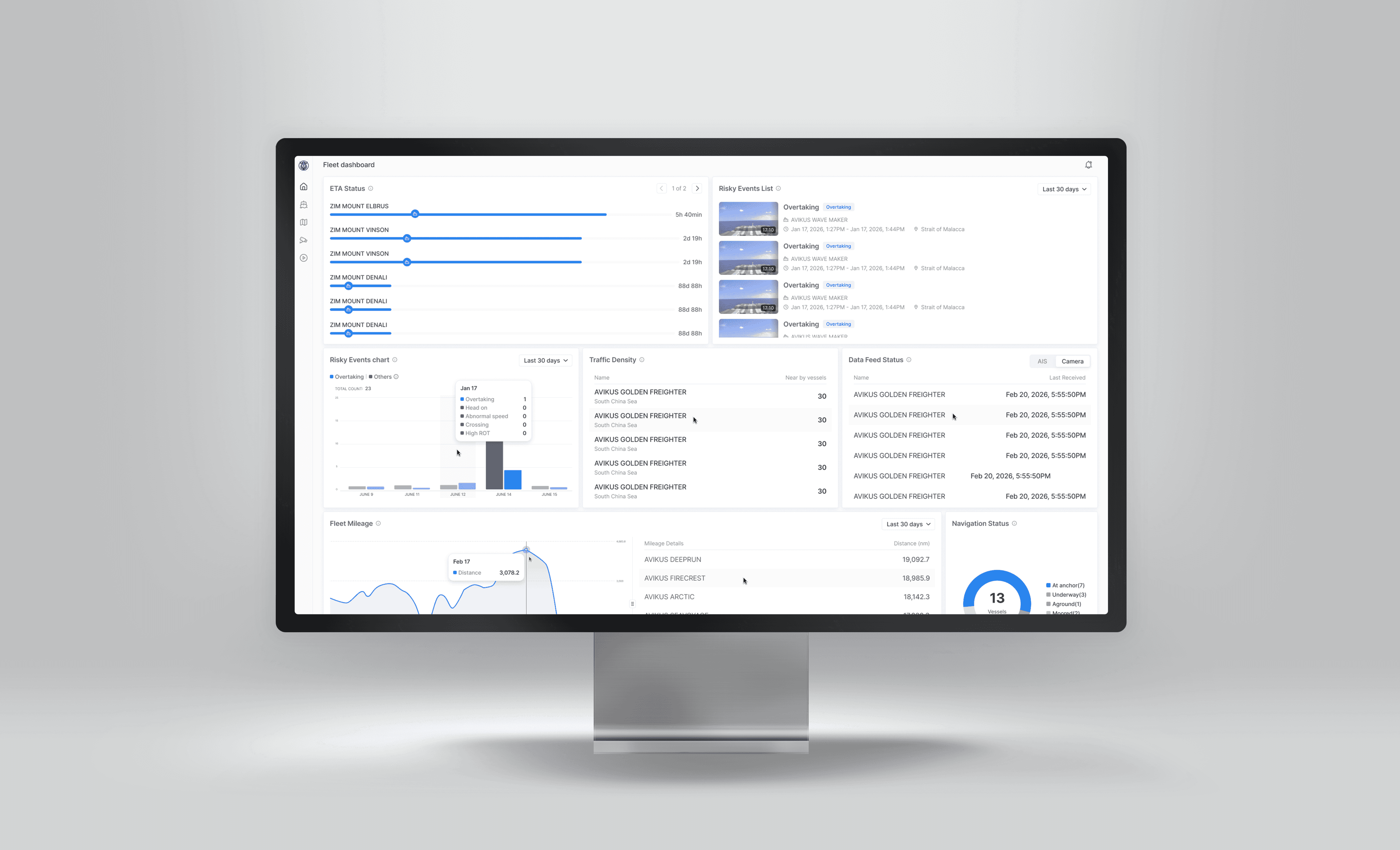 HiNAS (Hyundai Intelligent Navigation Assistant System) Cloud is a web-based platform developed by Avikus for comprehensive fleet management and analytics. It acts as a central hub, connecting to HiNAS systems onboard ships, enabling real-time monitoring, playback analysis, and enhanced safety and operational efficiency for onshore teams.